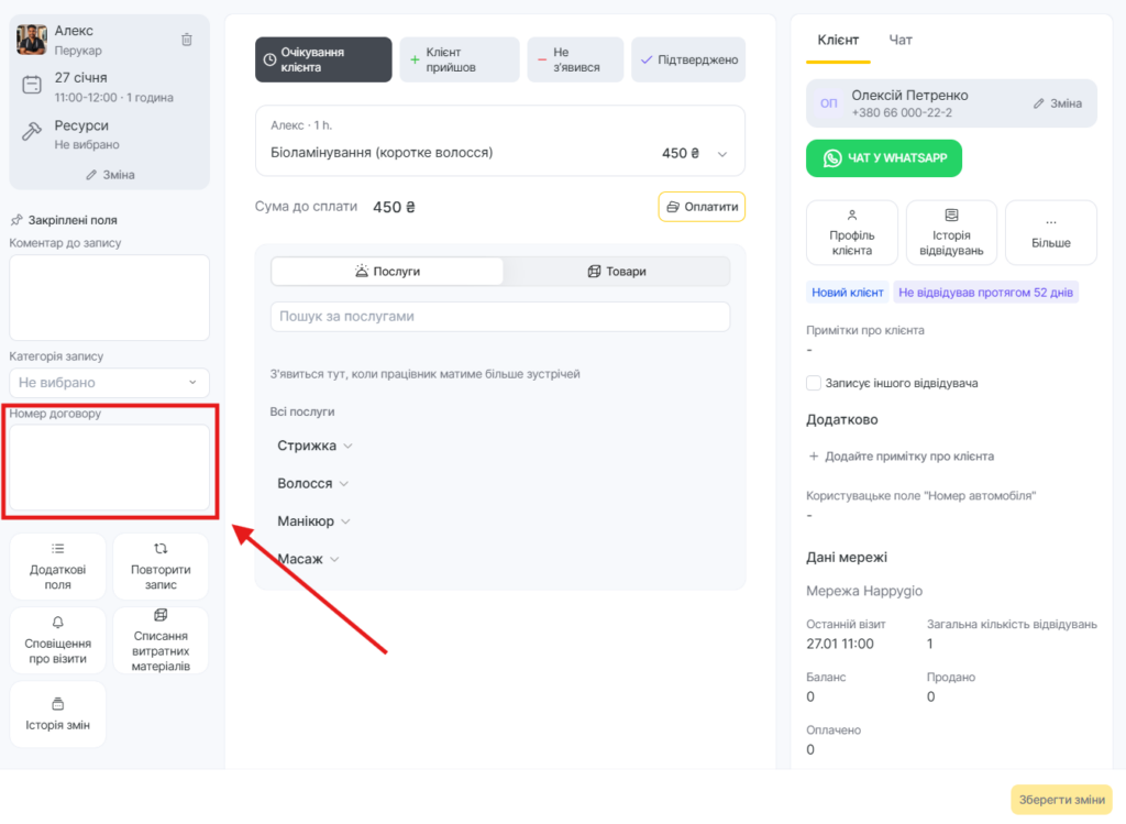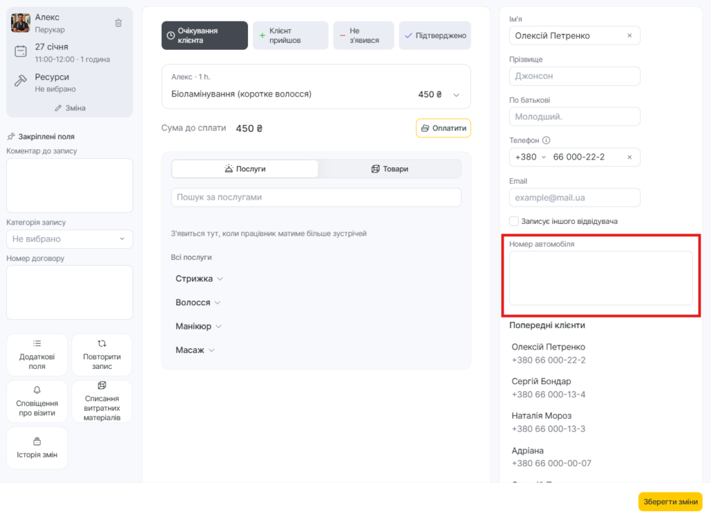 У Alltegio передбачена можливість створення додаткових полів в картці запису і в картці клієнта. Це дуже зручно, якщо при записі необхідно крім контактної інформації вказати ще й службову.