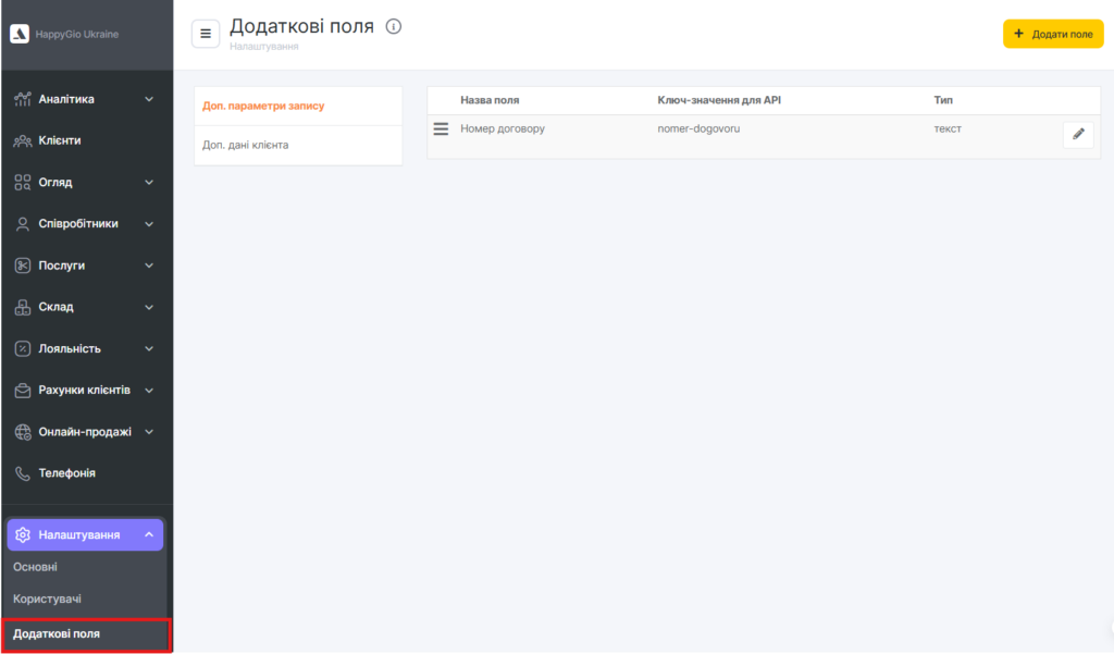 Дополнительные поля можно настроить в сетевом интерфейсе (Сеть > Налаштування > Додаткові поля). Після цього їх можна використовувати в будь-якому філіалі мережі, обраному в налаштуваннях поля. Також доступна можливість відображати додаткові поля, створені в мережі, у віджетах онлайн-запису.Додаткові поля також можна налаштувати в інтерфейсі філіалу — у цьому випадку вони відображатимуться лише в тому філіалі, де були створені.