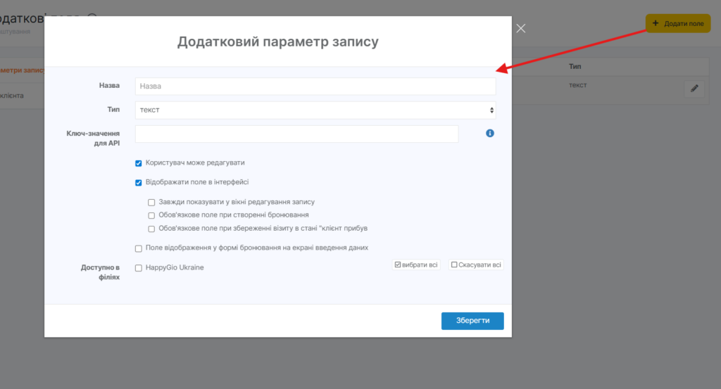 - Виберіть, які додаткові параметри ви хочете додати: параметри запису або дані клієнта, Перейдіть на відповідну вкладку і натисніть кнопку Додати поле.