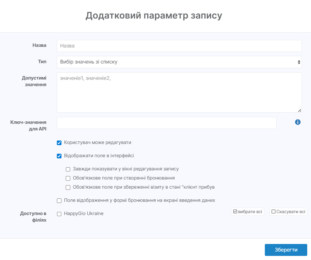 - Обов’язково оберіть філіали, у яких буде доступне додаткове поле. Навіть якщо у вашій мережі лише один філіал, його все одно потрібно відмітити, щоб поле було доступне.