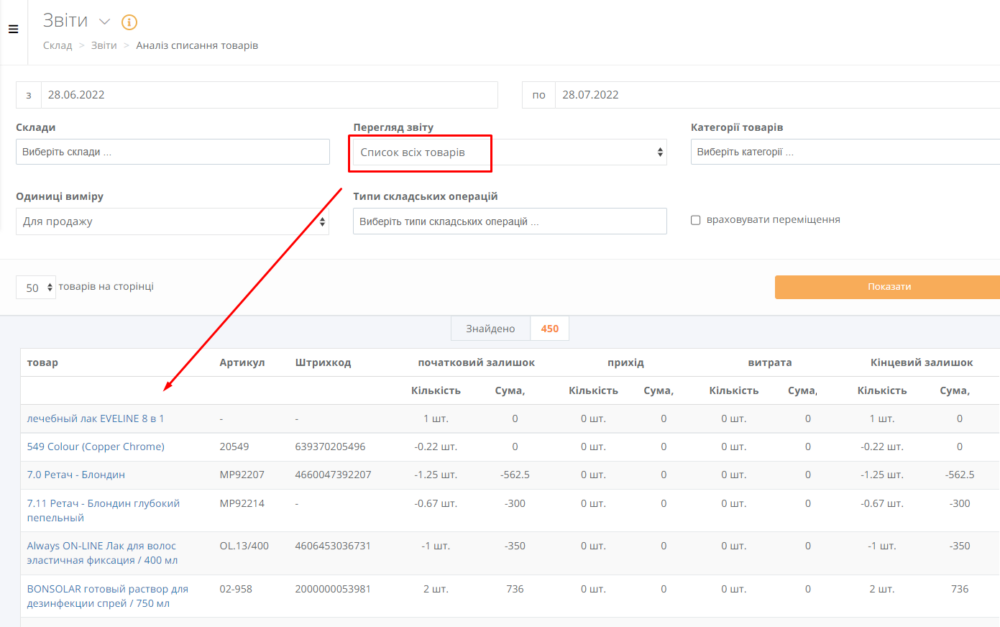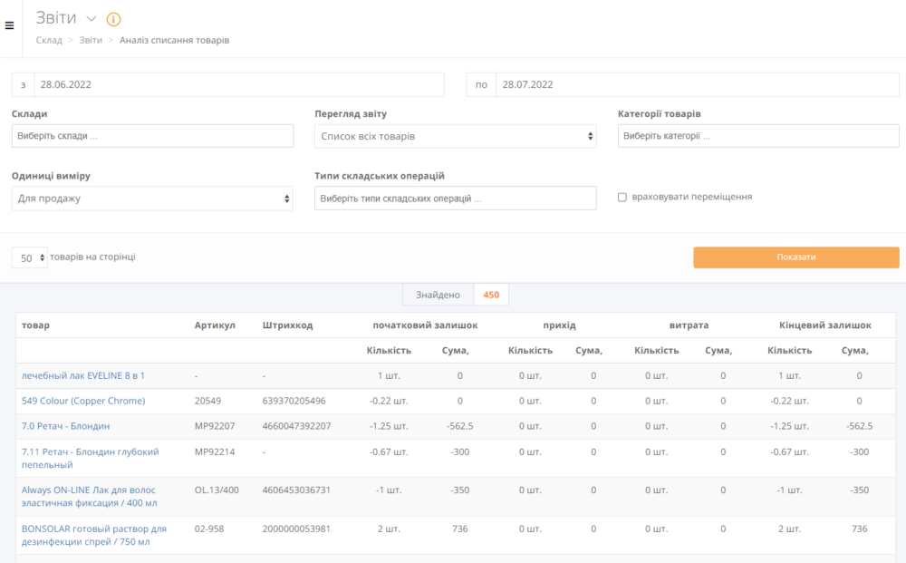 Звіт зі списання товарів можна переглянути в розділі Склад-аналіз списання товарів.