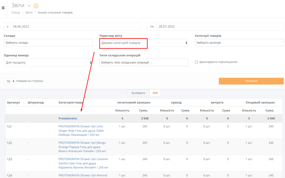 Також можна налаштувати відображення інформації в стовпці товари. Для цього в пункті перегляд звіту оберіть, як будуть відображатися товари: у вигляді списку або у вигляді дерева категорій