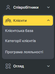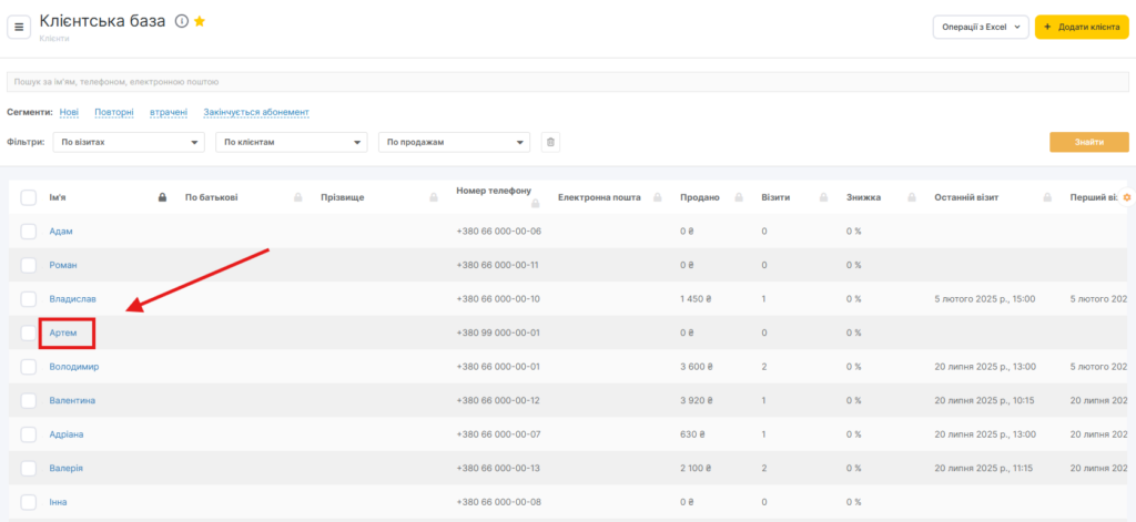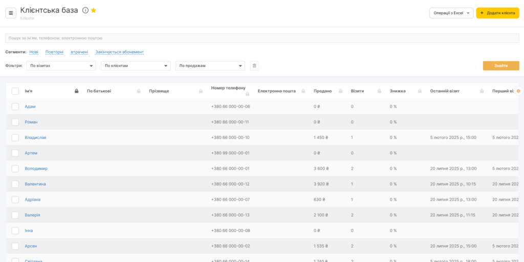 У розділі Клієнти > Клієнтська база відображається інформація про всіх клієнтів, які відвідували вашу компанію.