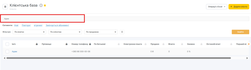 У розділі «Клієнтська база» доступний швидкий пошук за ім’ям, номером телефону, Email або номером картки. Для цього введіть значення в рядок пошуку та натисніть кнопку «Знайти».