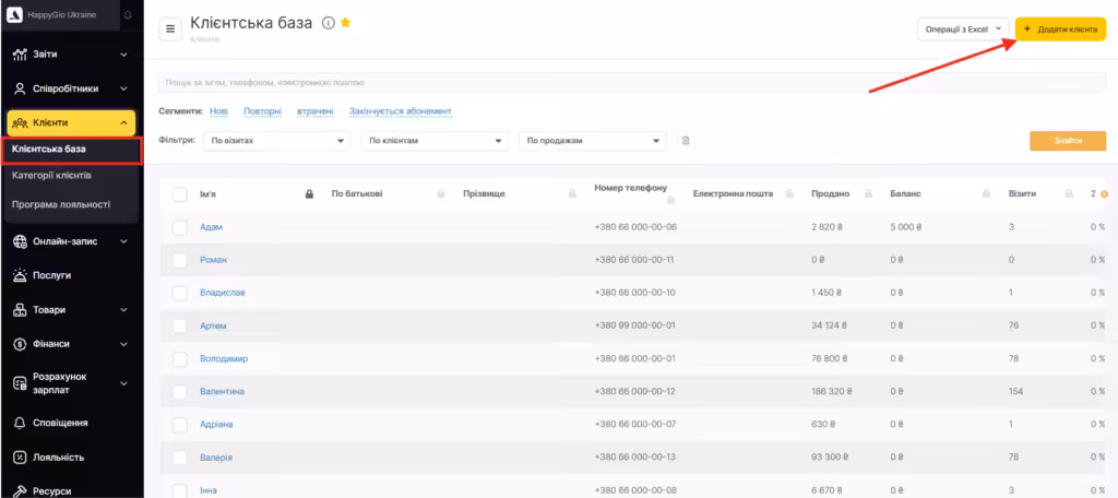 Щоб додати клієнта до клієнтської бази, перейдіть до розділу Клієнти > Клієнтська база та натисніть кнопку Додати клієнта.