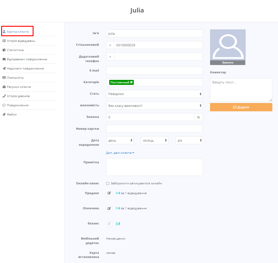 У цьому розділі зазначаються всі записи клієнта, співробітники, до яких він записувався, послуги, що були йому надані, придбані товари, знижки та оплачені суми, коментарі до запису, а також зазначаються філії, які відвідував клієнт.