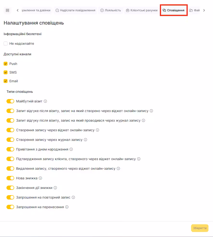 У картці клієнта можна налаштувати надсилання повідомлень певного типу або заборонити надсилання певних видів повідомлень.