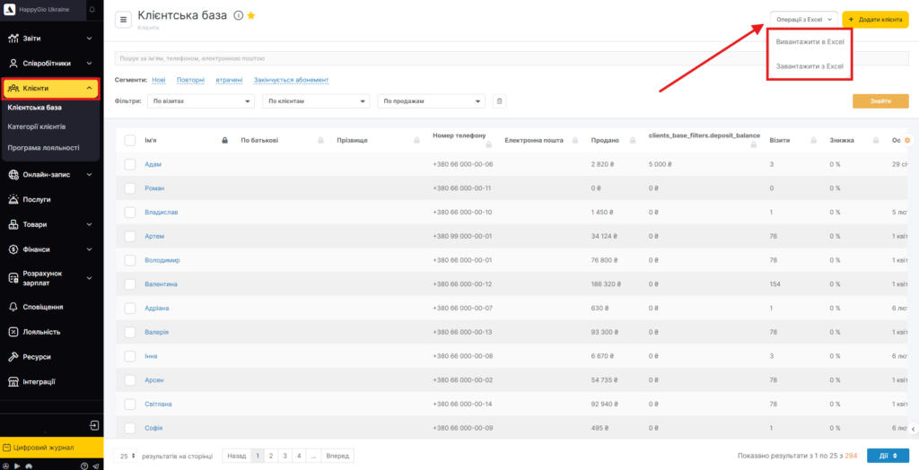 - Перейдіть у режим Адміністрація до розділу Клієнти > Клієнтська база. У блоці Операції з Excel виберіть Завантажити з Excel.