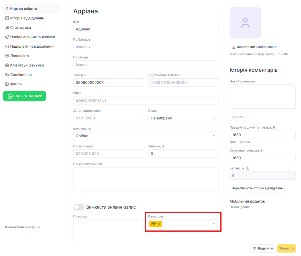 У розділі Клієнти > Клієнтська база (режим Адміністрація) відкрийте картку клієнта і в полі Категорія виберіть потрібну мітку зі списку, що випадає. Натисніть кнопку Зберегти.
