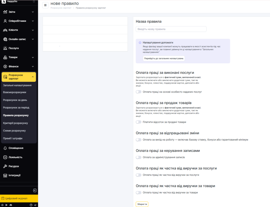 Для створення нового правила натисніть кнопку Додати правило. У вікні, вкажіть всю необхідну інформацію і натисніть кнопку Зберегти. Більш детальний опис цих налаштувань читайте в статті Створення нового правила розрахунку.