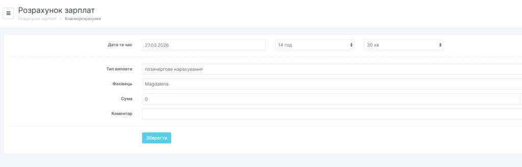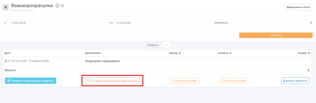У режимі Адміністрація перейдіть до розділу Розрахунок зарплат > Взаєморозрахунки, виберіть період та співробітника, якому потрібно нарахувати виплату, та натисніть кнопку Створити позачергове нарахування.
