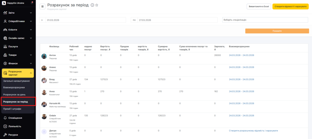 У Altegio є можливість зробити розрахунки за вказаний період та нарахувати зарплату кожному співробітнику окремо або одразу всім працівникам.