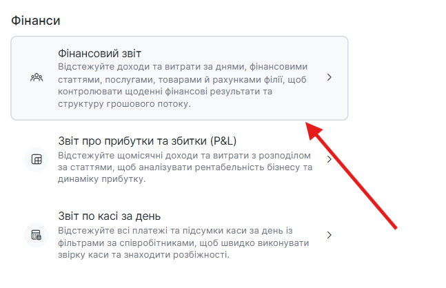 Щоб розпочати роботу, перейдіть до Звіти > Всі звіти > Фінанси > Фінансовий звіт.