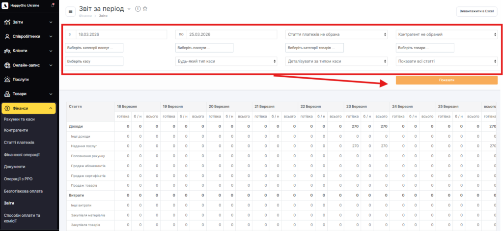 Звіт можна формувати за допомогою фільтрів: стаття платежів, контрагент, каса (можна вибрати кілька кас одночасно) або тип каси. Можна вибирати всі статті або лише статті з рухом коштів, а також категорії послуг та товарів або окремі послуги та товари.