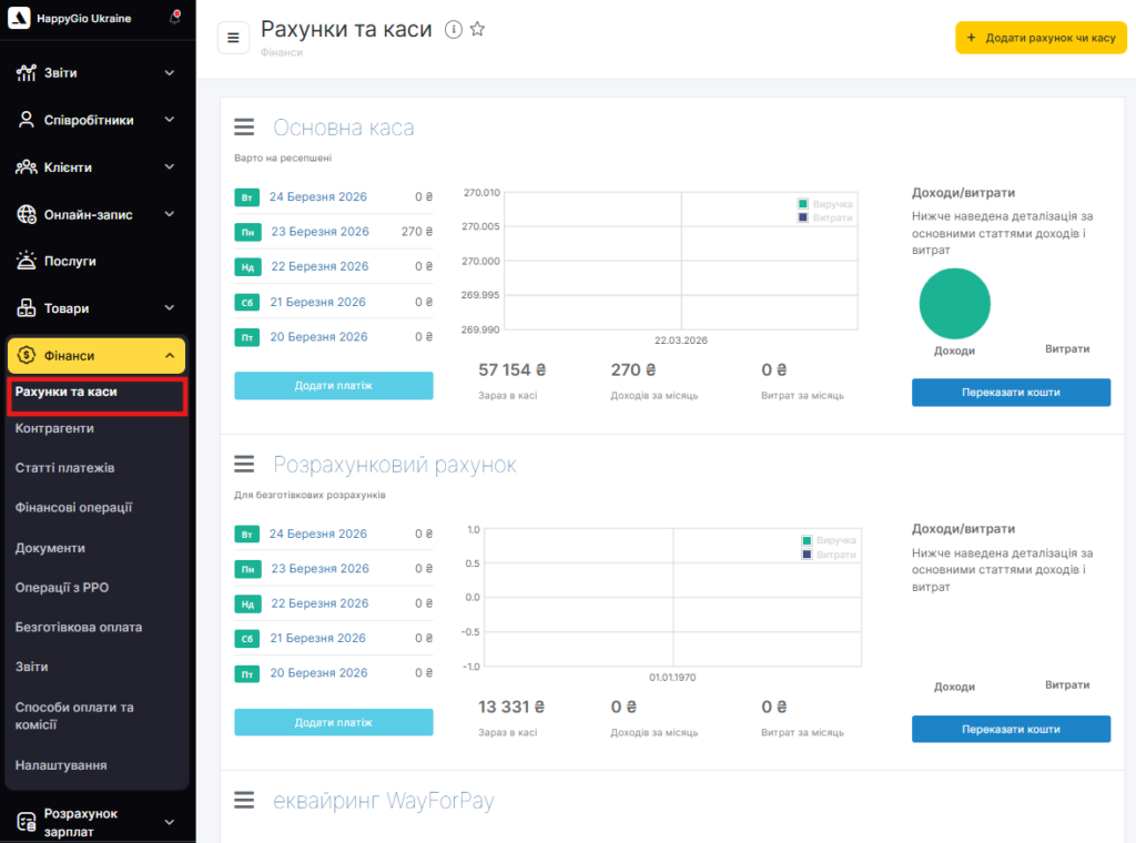 У цьому розділі відстежується руху грошей по кожній касі компанії в режимі реального часу. Відображаються всі доходи і витрати за місяць, останні надходження і списання. Тут можна зробити переказ коштів з однієї Каси в іншу і відредагувати інформацію про каси.