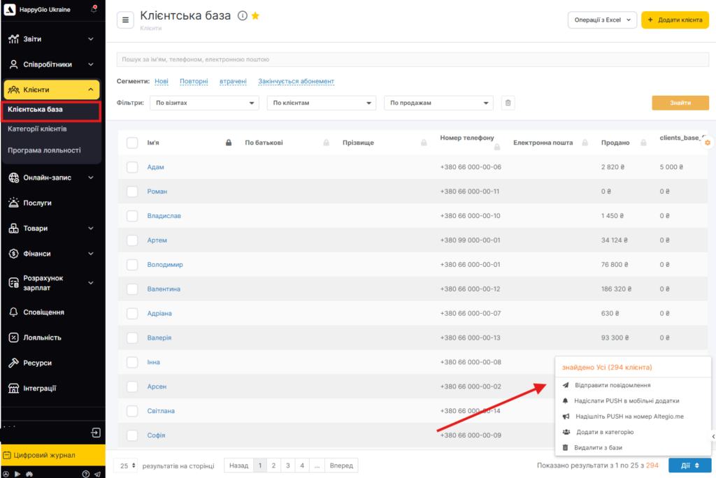 У Altegio також можна надсилати індивідуальні SMS-повідомлення для кожного клієнта. Зробити це можна двома засобами: