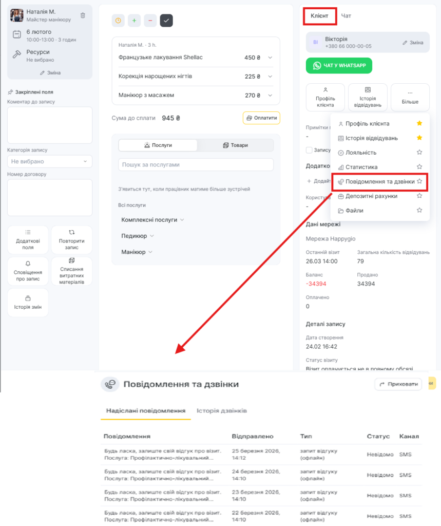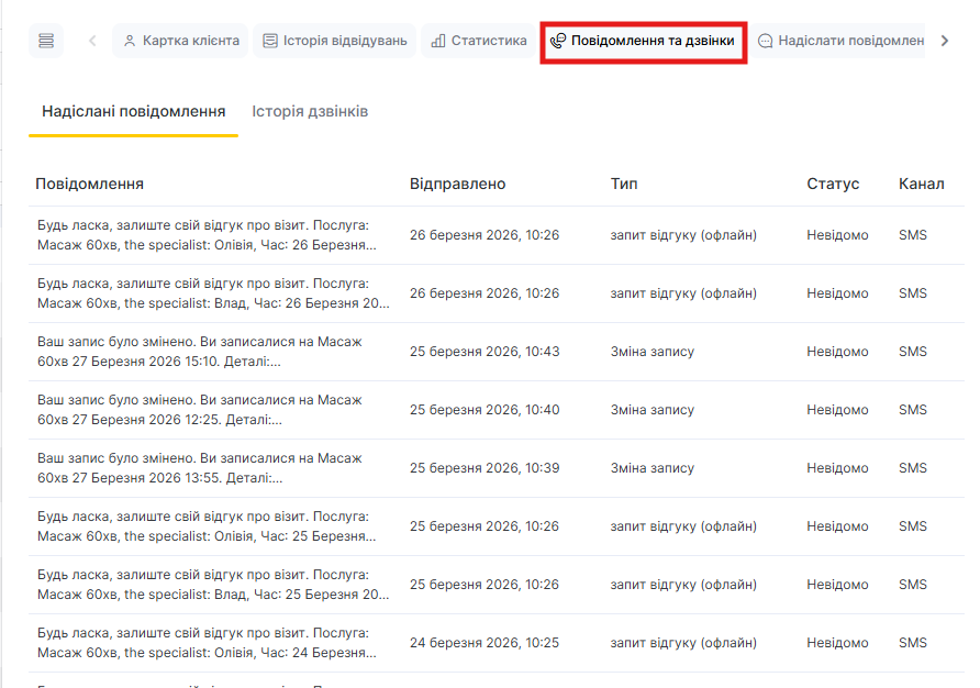 У розділі Клієнти > Клієнтська база перейдіть до картки клієнта, історію повідомлень якого хочете переглянути, та перейдіть до розділу Повідомлення і дзвінки