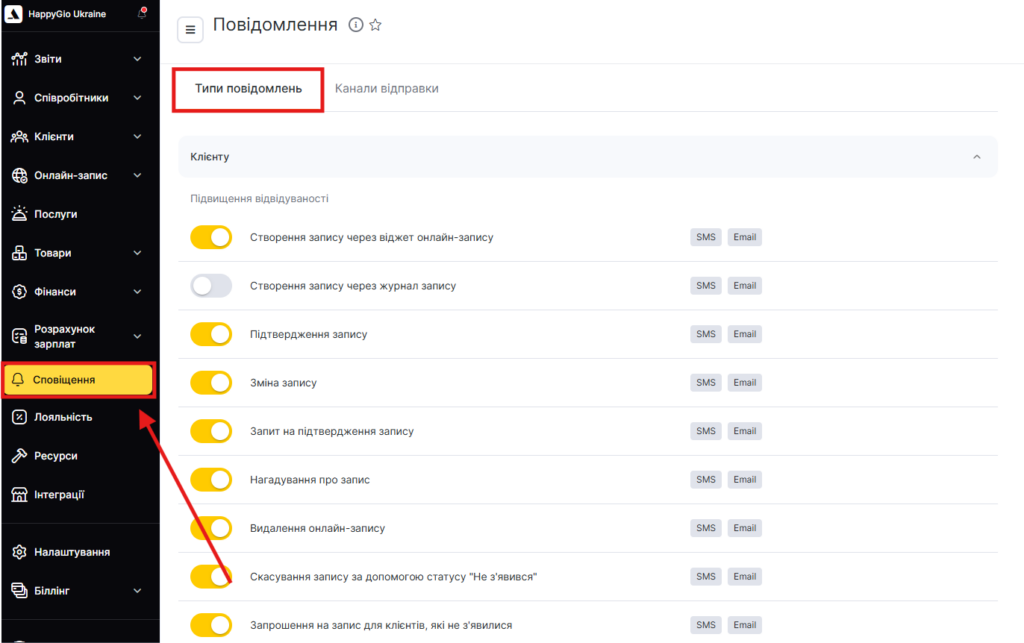 У режимі Адміністрація перейдіть до розділу Сповіщення та відкрийте вкладку Типи повідомлень. Тут можна налаштувати та вмикати/вимикати надсилання повідомлень, які відправляються в залежності від події.