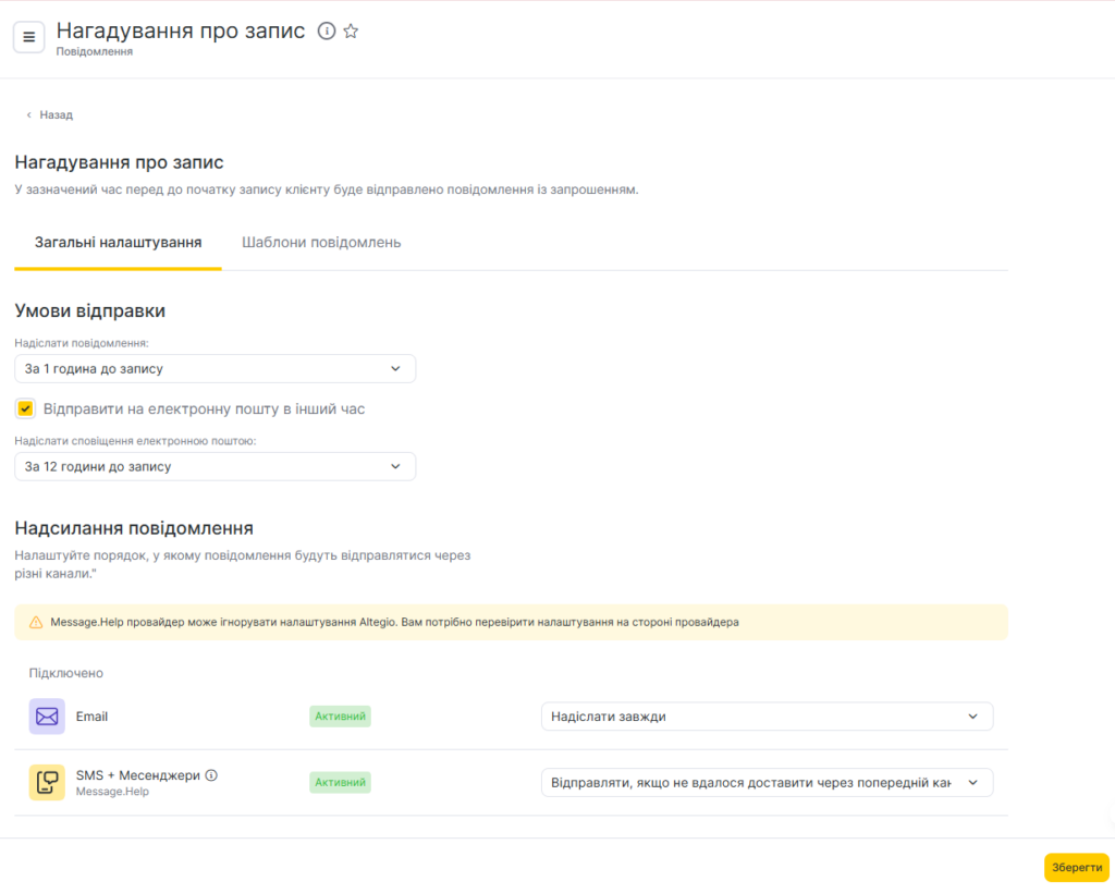 Налаштування надсилання повідомлень можуть відрізнятися залежно від обраного партнера. Наприклад, для чат-ботів повідомлення також можуть налаштовуватися в особистому кабінеті партнера. Для SMS-агрегаторів, як правило, повідомлення налаштовуються в Altegio. Деталі налаштування слід уточнювати у чат-бота або SMS-агрегатора.