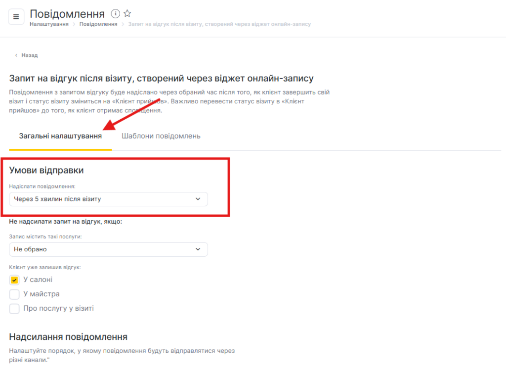 Запит відгуку надсилається через задану кількість хвилин або годин, якщо клієнта було переведено у статус Клієнт прийшов до завершення формування сповіщення.