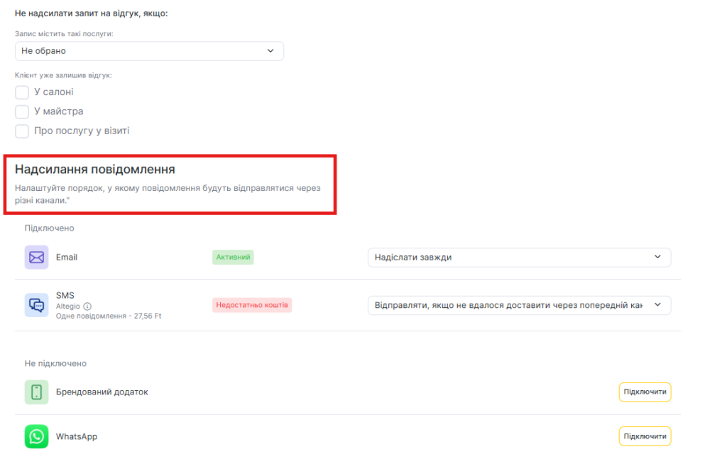 - Якщо клієнт уже залишав відгук у цьому філіалі (будь-який — самостійно через віджет або через повідомлення із запитом відгуку), запит не буде надіслано.