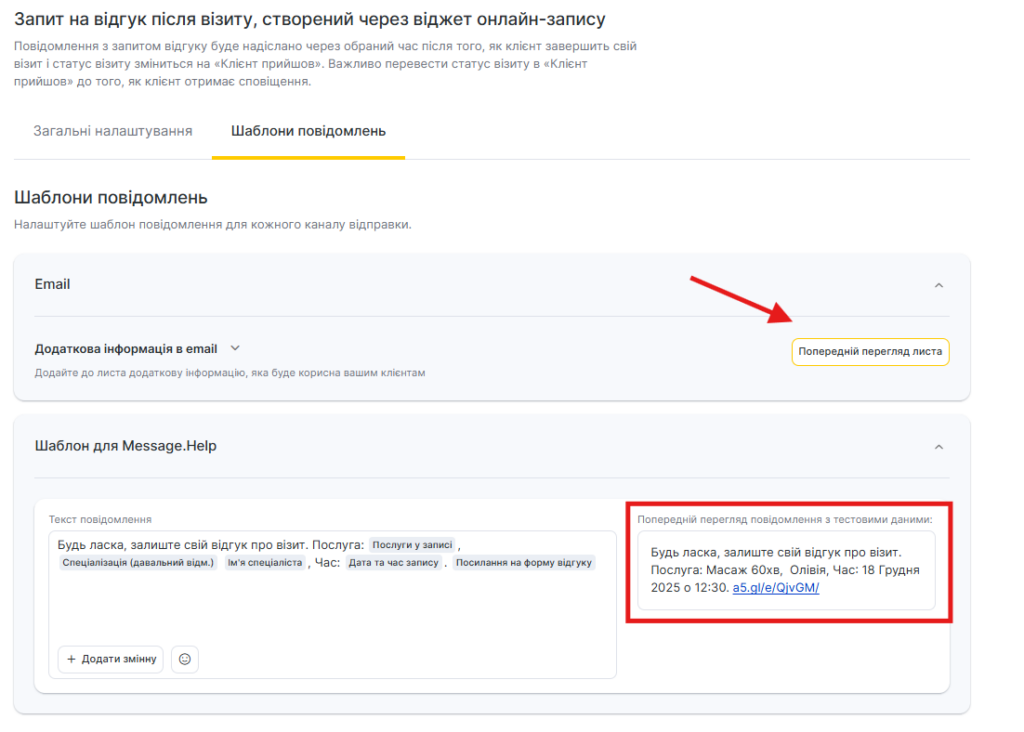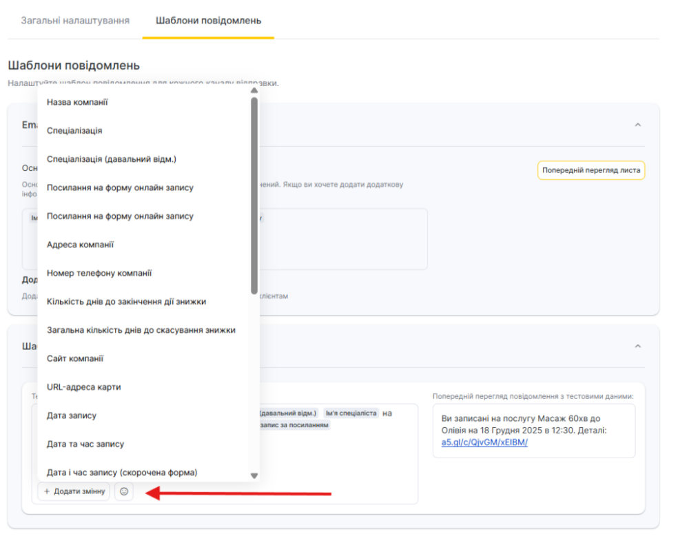 Для всіх шаблонів сповіщень доступний попередній перегляд — як виглядатиме повідомлення під час відправлення клієнту, співробітнику або адміністратору з урахуванням змінних.