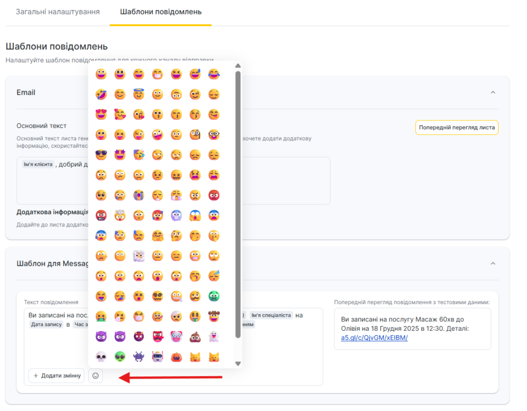 - У SMS-шаблонах сповіщень ви можете використовувати Emoji, для цього натисніть кнопку зі смайлом та оберіть потрібний із запропонованих або додайте власний.
