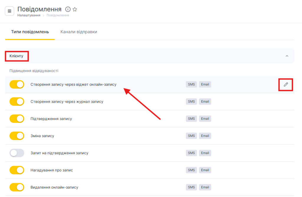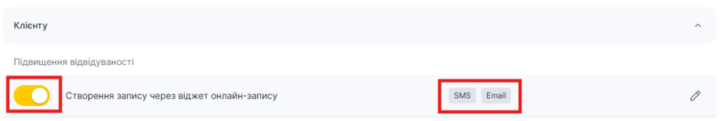 - У блоці Клієнту виберіть тип Створення запису через віджет онлайн-запису та натисніть кнопку Змінити із зображенням олівця.