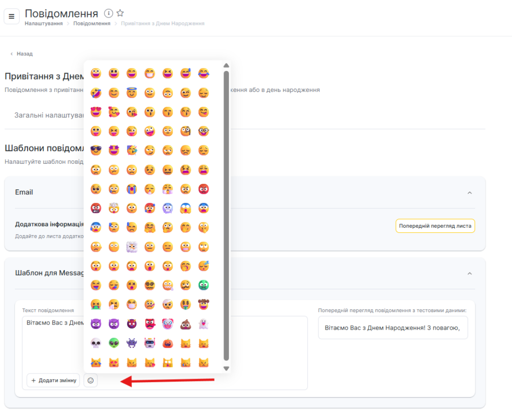 У SMS-шаблонах сповіщень ви можете використовувати Emoji, для цього натисніть кнопку зі смайлом і виберіть потрібний із запропонованих або додайте власний.
