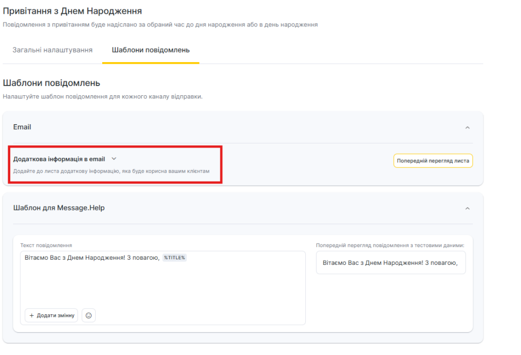 - Для каналу Email редагування шаблону недоступне, але можна додати додаткову інформацію. Для цього: