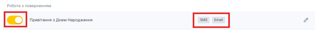 - У блоці Клієнту → Робота з поверненням клієнтів виберіть тип Привітання з днем народження, натиснувши на назву сповіщення або іконку олівця.