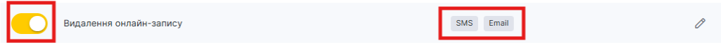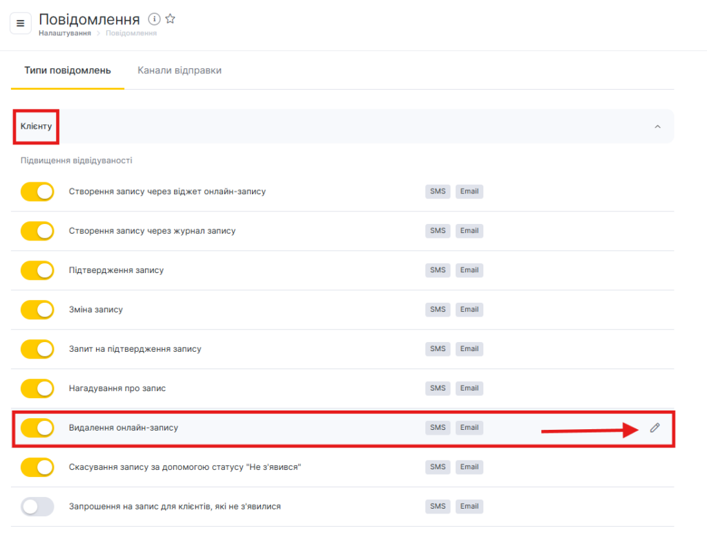 - У блоці Клієнту → Збільшення відвідуваності виберіть тип Скасування запису, натиснувши на назву сповіщення або іконку олівця.