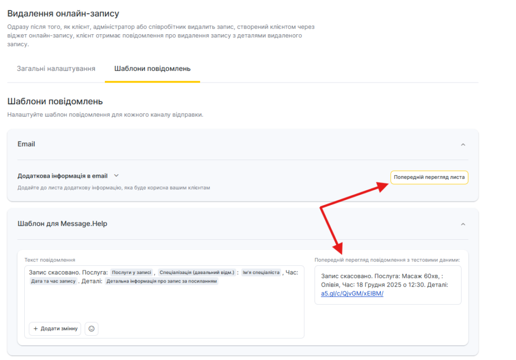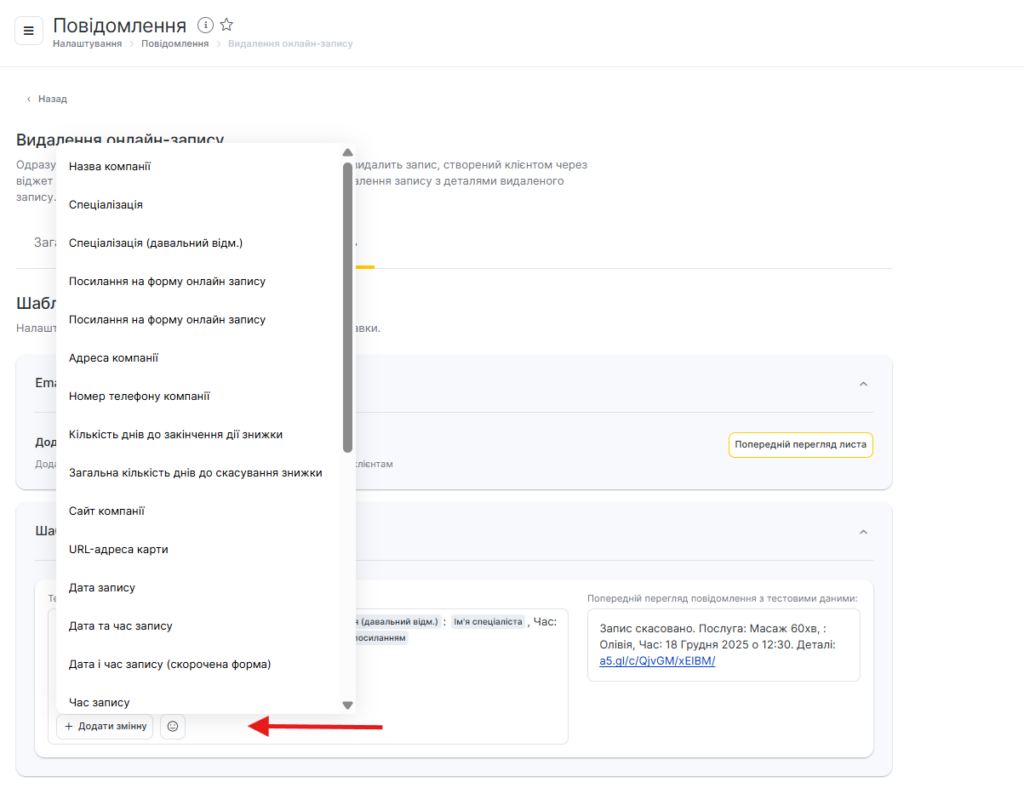 Для всіх шаблонів сповіщень доступний попередній перегляд — як виглядатиме повідомлення під час відправлення клієнту, співробітнику або адміністратору з урахуванням змінних.