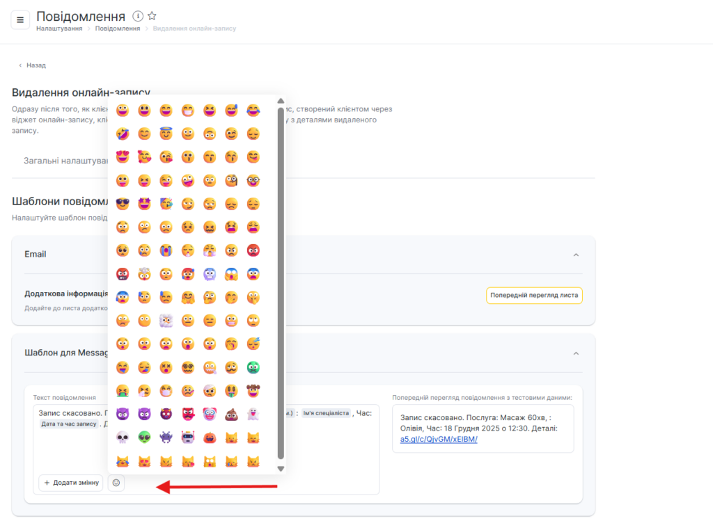 У SMS-шаблонах сповіщень ви можете використовувати Emoji, для цього натисніть кнопку зі смайлом і виберіть потрібний із запропонованих або додайте власний.