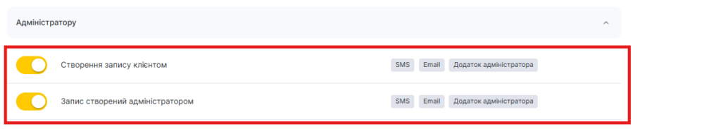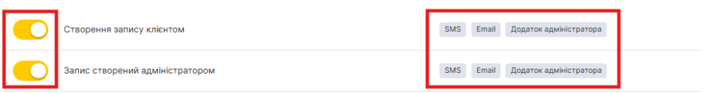 Автоматичні повідомлення, що надсилаються адміністратору відразу після запису. Налаштовуються два типи повідомлень: про онлайн-запис та запис, створений у журналі.