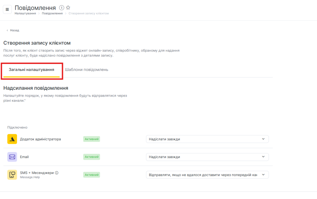 - На вкладці Загальні налаштування налаштуйте, як саме будуть надсилатися сповіщення через кілька каналів.