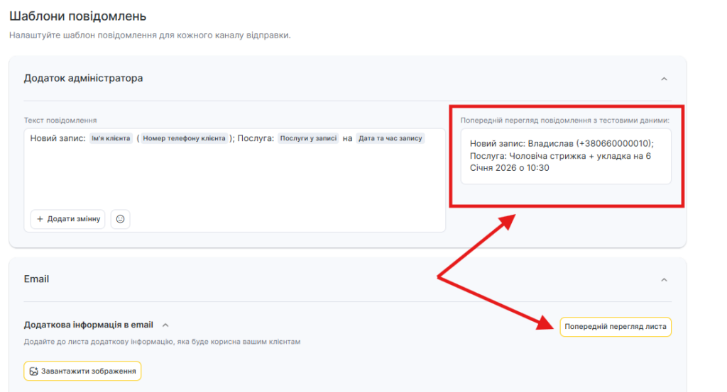 - Для всіх шаблонів сповіщень доступний попередній перегляд — як виглядатиме повідомлення під час відправлення клієнту, співробітнику або адміністратору з урахуванням змінних.
