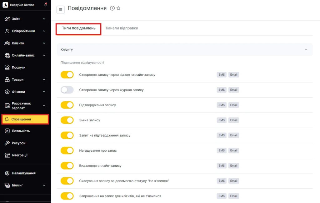 - Щоб увімкнути сповіщення, поверніться на вкладку Типи сповіщень і переведіть перемикач в активний стан. Щоб вимкнути сповіщення, переведіть перемикач у неактивний стан. Праворуч від назви сповіщення відображатимуться назви каналів відправлення, які увімкнені для цього типу.