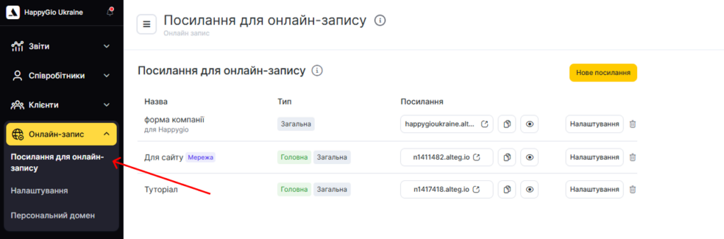 - Перейдіть до розділу Онлайн-запис > Посилання для онлайн-запису.