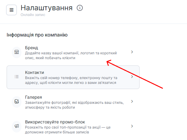 - У розділі Онлайн-запис > Налаштування перейдіть до блоку Бренд.