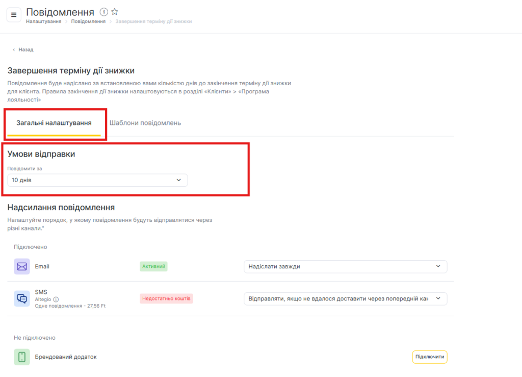 - Оберіть, за скільки днів до завершення дії знижки клієнт отримуватиме сповіщення