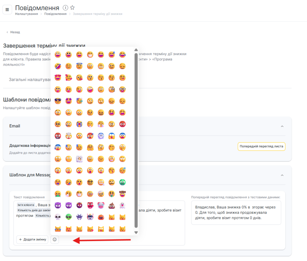 У SMS-шаблонах сповіщень ви можете використовувати Emoji, для цього натисніть кнопку зі смайлом і виберіть потрібний із запропонованих або додайте власний.