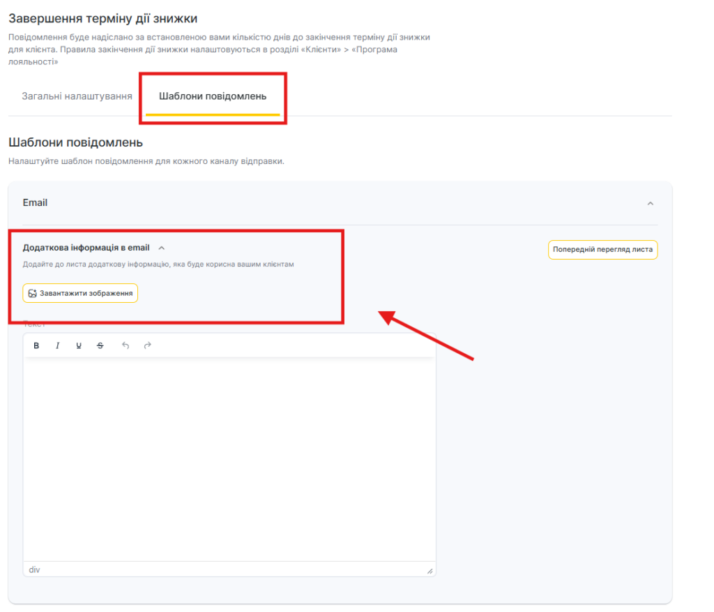 - Для каналу Email редагування шаблону недоступне, але можна додати додаткову інформацію. Для цього: