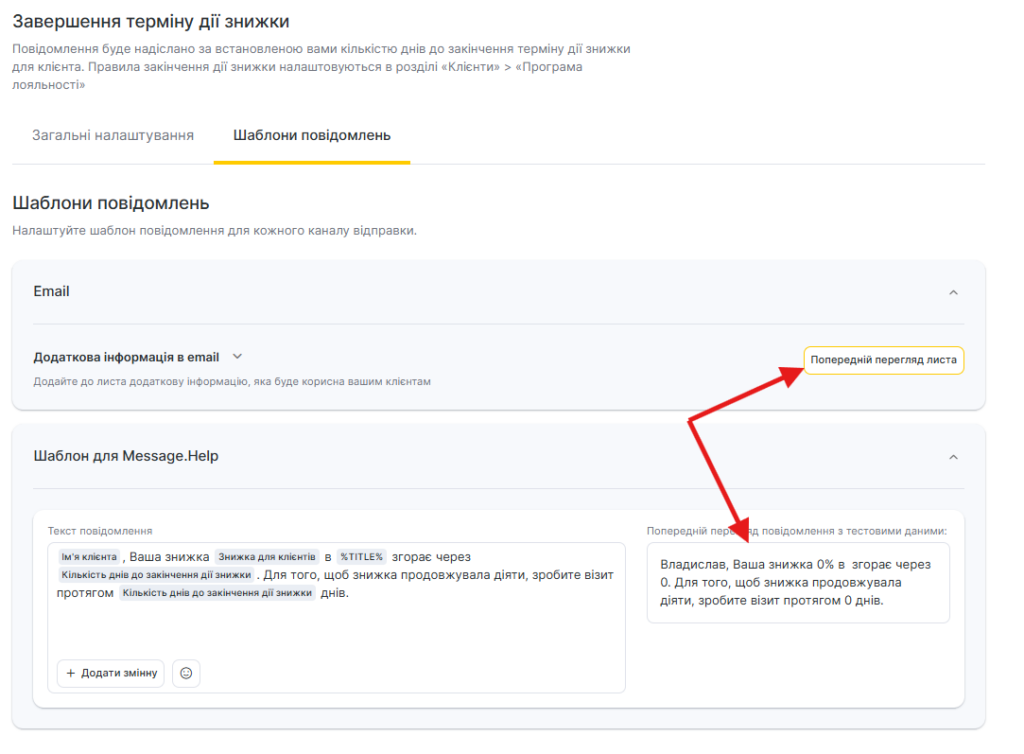 Для всіх шаблонів сповіщень доступний попередній перегляд — як виглядатиме повідомлення під час відправлення клієнту, співробітнику або адміністратору з урахуванням змінних.