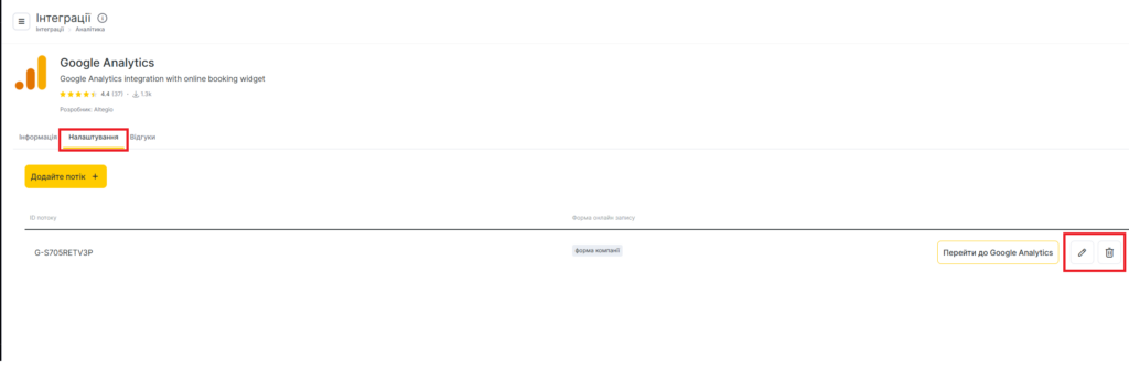 Щоб видалити раніше доданий ідентифікатор, натисніть кнопку з іконкою кошика навпроти потоку. Натисніть Видалити потік — після цього інформація буде видалена з Altegio, але залишиться в Google Аналітиці.