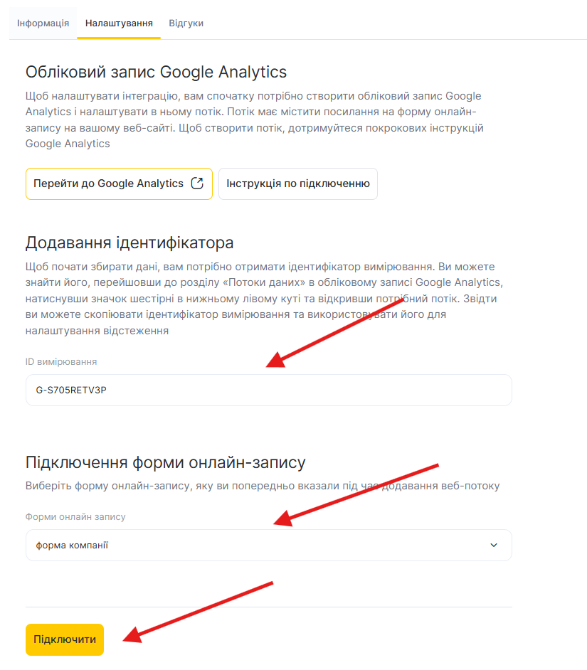 - Нижче оберіть зі списку форму онлайн-запису, до якої хочете підключити Google Analytics.