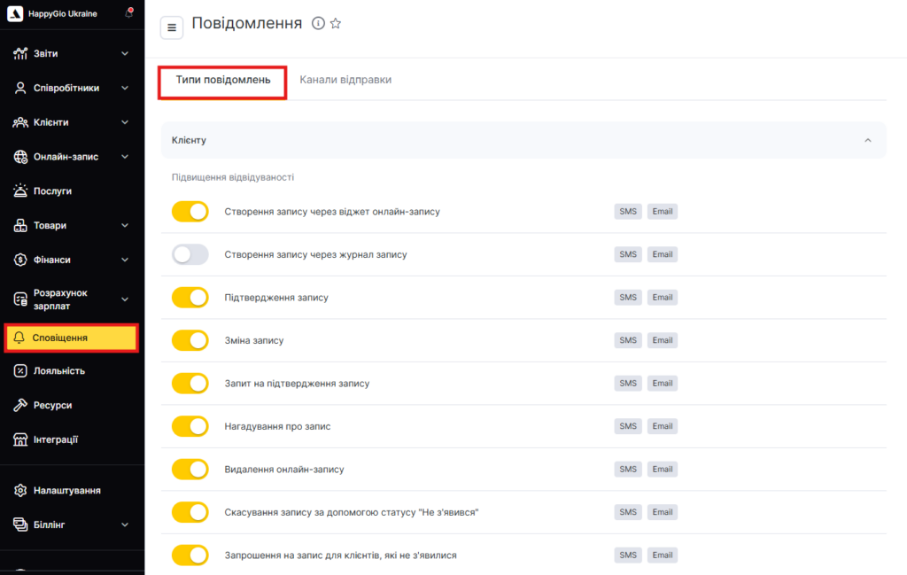 - У режимі Адміністрація перейдіть до розділу Сповіщення на вкладку Типи повідомлень.