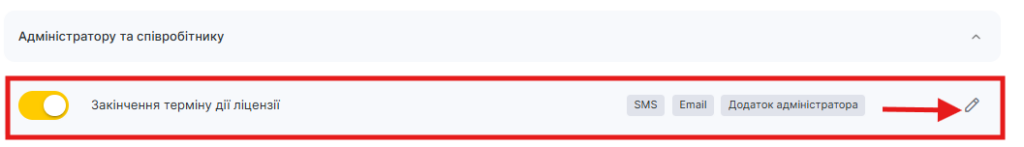 - У блоці Адміністратору та співробітнику виберіть тип Закінчення терміну дії ліцензії та натисніть на кнопку Змінити із зображенням олівця.