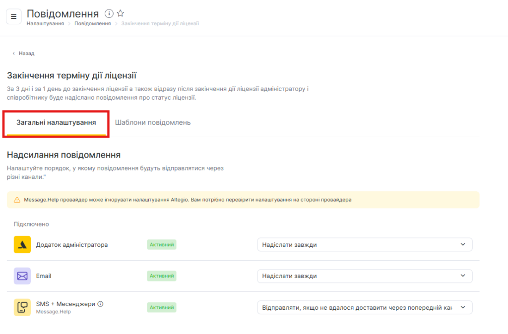 - На вкладці Загальні налаштування налаштуйте, як саме будуть надсилатися сповіщення через кілька каналів.