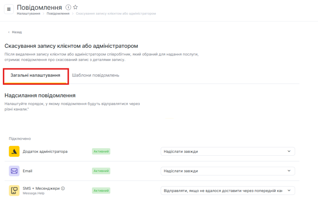 - На вкладці Загальні налаштування налаштуйте, як саме будуть надсилатися сповіщення через кілька каналів.